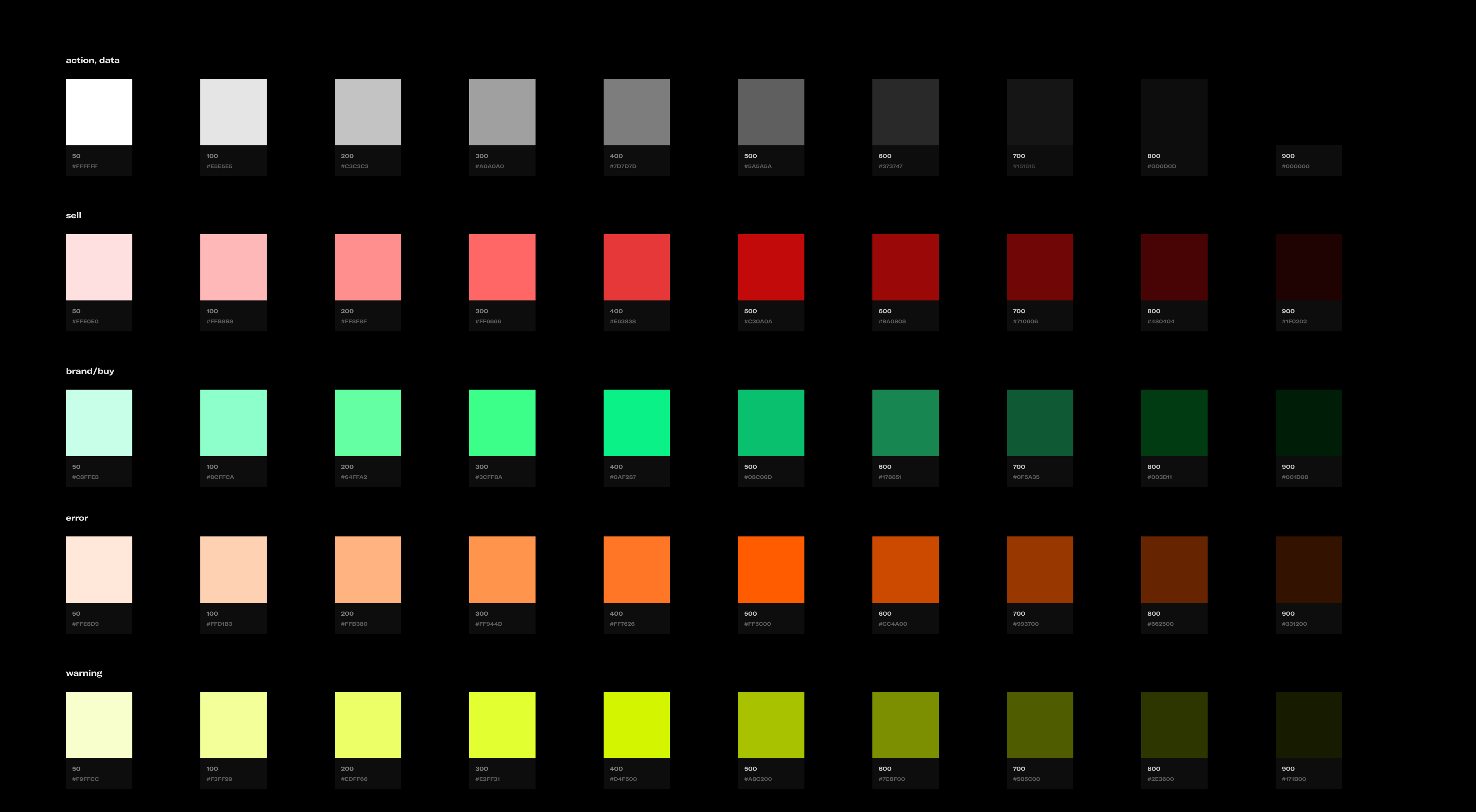 White is the major action color in order not to distract from the primary trading actions set in traditional red/green colors, and to keep colors minimal.
