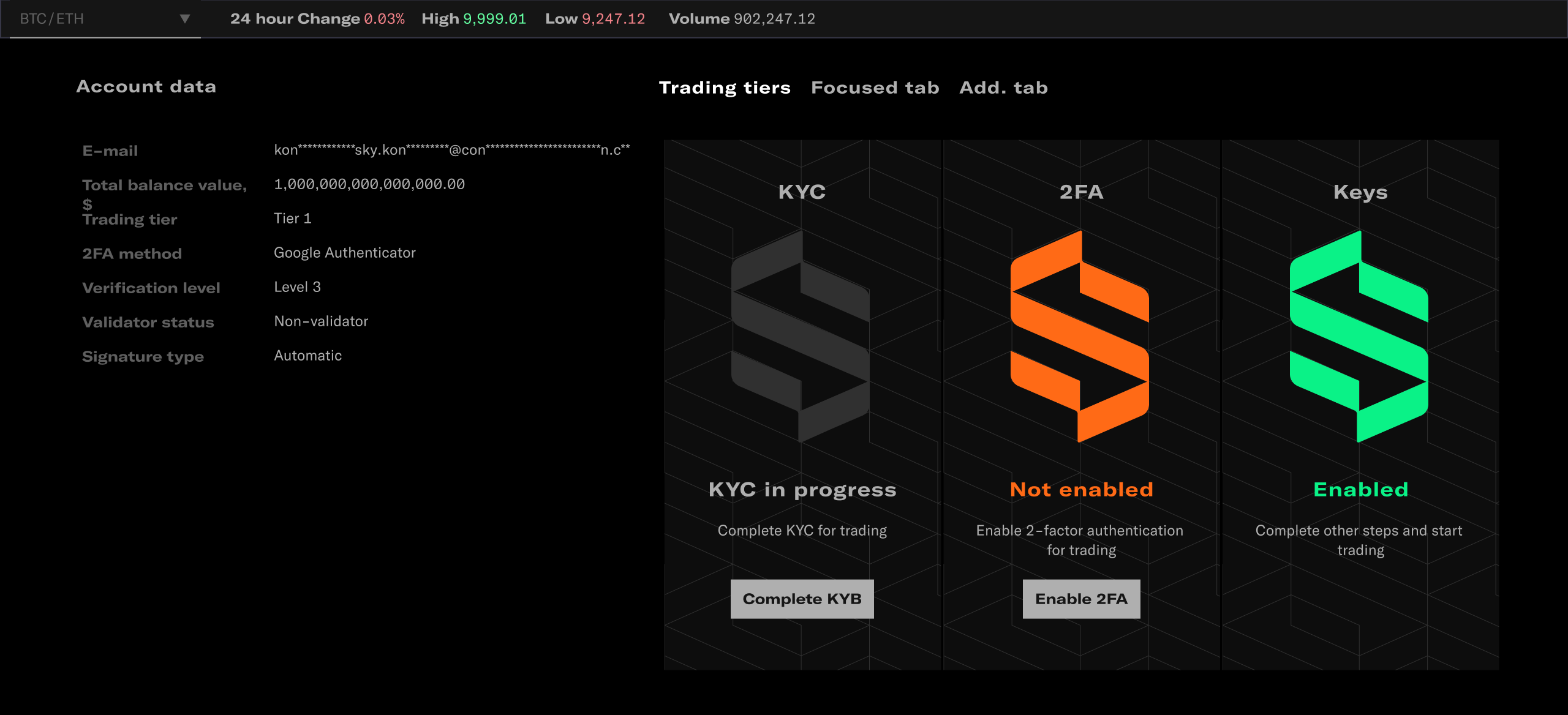 Complete all three required steps and start trading. KYC, Security, Blockchain access.